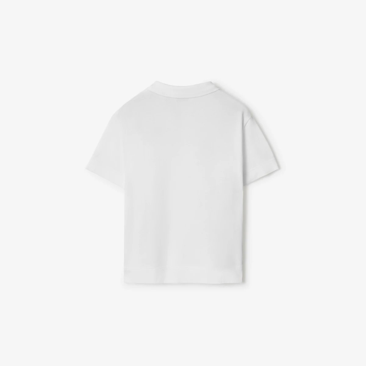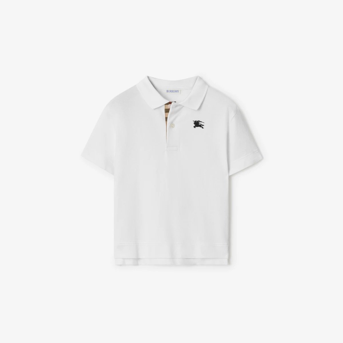 A polo shirt in cotton printed with Burberry logo and Equestrian Knight Design in the style of an ink stamp. The collar is knitted with the Burberry Check in signature sand beige.